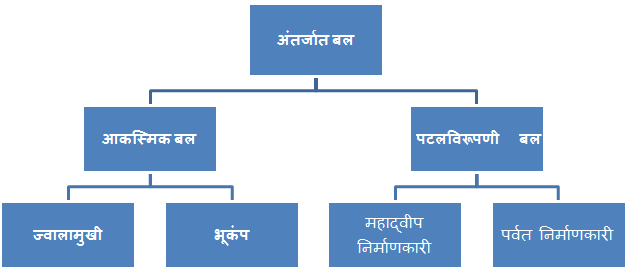 - इन बलों को आकस्मिक (Sudden) और पटलविरूपणी बलों (Diastrophic forces) में विभाजित किया गया है। विवरण चार्ट के माध्यम से प्रस्तुत किया गया है: