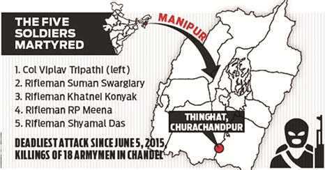 - इस हमले में 46 असम राइफल्स के कमांडिंग ऑफिसर कर्नल विप्लव त्रिपाठी, उनका परिवार और चार क्विक रिएक्शन टीम (QRT) के 4 जवान शहीद हो गए।