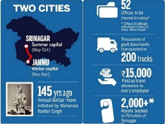 - दरबार मूव राजधानी स्थानांतरण की एक सदियों पुरानी प्रथा है जिसमें जम्मू-कश्मीर सरकार 6-6 महीने राज्य की दो राजधानियों- श्रीनगर एवं जम्मू में काम करती है।