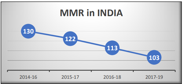 - देश में एमएमआर में लगातार कमी आई है। यह 2014-2016 में 130 था, जो 2015-2017 में घटकर 122, 2016-2018 में कम होकर 113 और 2017-2019 में 103 रह गया।