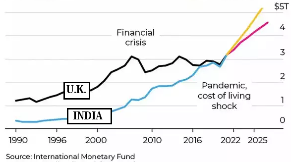 - ब्लूमबर्ग की रिपोर्ट के अनुसार, समायोजित आधार (Adjusted Basis) पर एवं डॉलर विनिमय दर (Dollar Exchange Rate) का उपयोग करते हुए, जनवरी-मार्च 2022 के अंत तक भारतीय अर्थव्यवस्था का आकार 854.7 बिलियन अमेरिकी डॉलर था, जबकि यूके की अर्थव्यवस्था का आकार 816 बिलियन अमेरिकी डॉलर था|