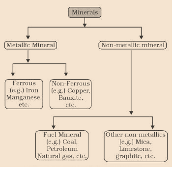 On the basis of chemical and physical properties, minerals may be grouped under two main categories of metallics and non-metallics which may further be classified as follows: