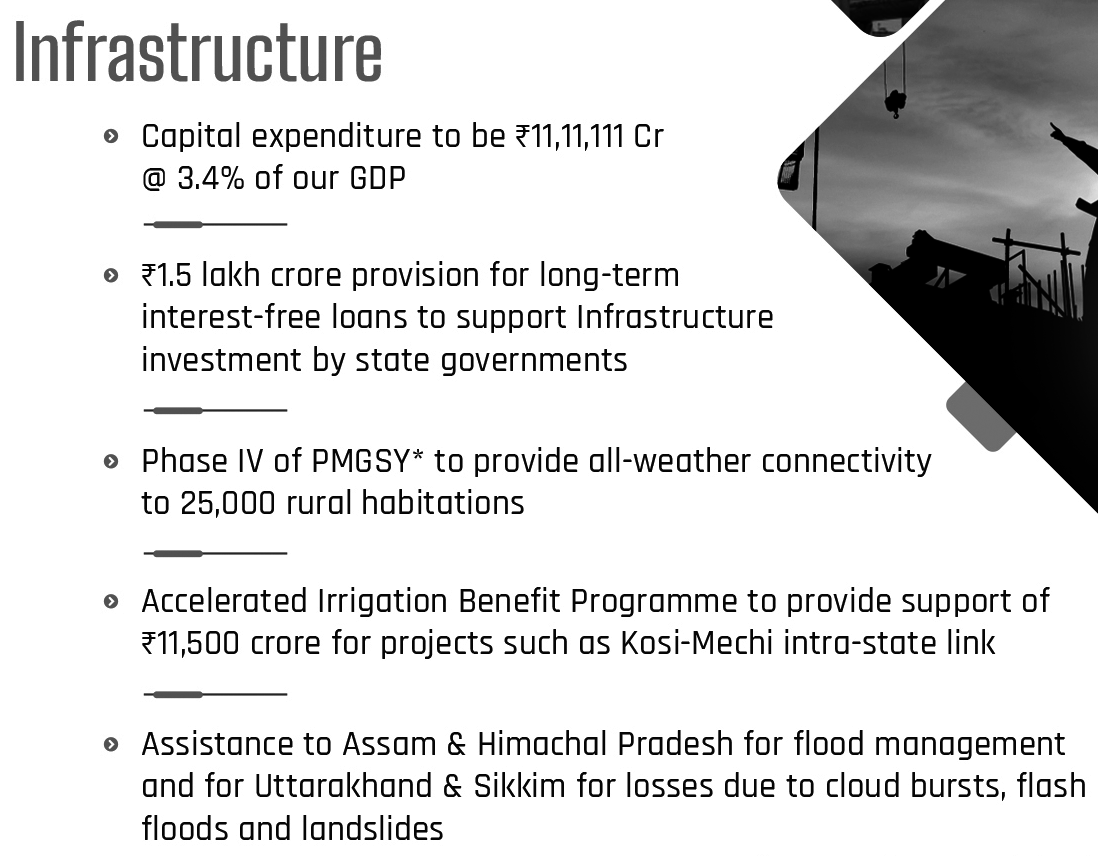 - Infrastructure investment by Central Government: Rs 11,11,111 crore (3.4 % of GDP) to be provided for capital expenditure.
