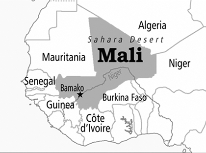 - माली (राजधानी-बमाको) पश्चिमी अफ्रीका का एक स्थल-रुद्ध देश है। इसके उत्तर में अल्जीरिया, पूर्व में नाइजर एवं बुर्किना फासो, दक्षिण में आइवरी कोस्ट एवं गिनी तथा पश्चिम में सेनेगल एवं देश मॉरिटानिया स्थित हैं।