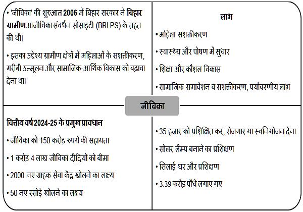 बिहार सरकार की महत्वाकांक्षी परियोजना 'जीविका' के महत्व और वित्तीय वर्ष 2024-25 के प्रमुख प्रावधानों की व्याख्या करें।
