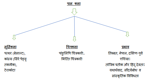 - पाल कला बौद्ध धर्म, विशेषकर महायान और वज्रयान से प्रभावित थी। इसने भारत के साथ-साथ तिब्बत, नेपाल और दक्षिण-पूर्व एशिया में भी अपनी छाप छोड़ी