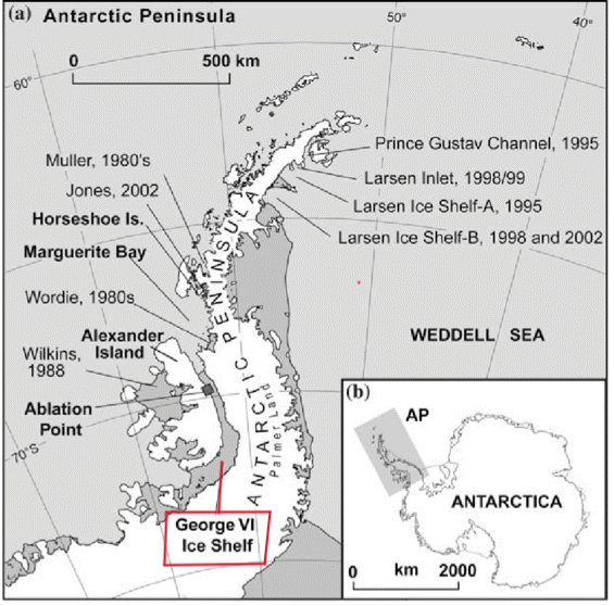 - जॉर्ज VI आइस शेल्फ अंटार्कटिका में स्थित है, जो अलेक्जेंडर द्वीप को पामर लैंड से अलग करता है।