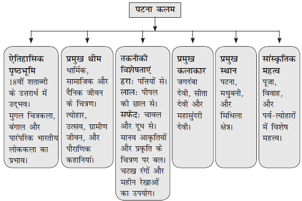 - पटना कलम कला 18वीं शताब्दी के उत्तरार्ध में विकसित हुई एक अद्वितीय चित्रकला शैली है, जो मुगल, बंगाल और पारंपरिक भारतीय लोककला के प्रभावों का समन्वय है। इसका ....