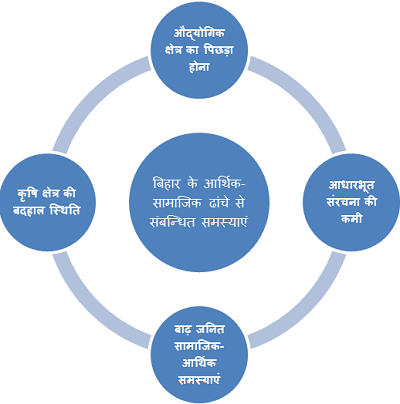 बिहार भारत के सबसे पिछड़े राज्यों में से एक है जहां का आर्थिक-सामाजिक ढांचा काफी पिछड़ा हुआ है। बिहार के आर्थिक-सामाजिक ढांचे से संबन्धित समस्याएं निम्नलिखित हैं-