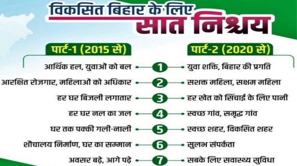 बिहार सरकार द्वारा राज्य के सामाजिक-आर्थिक विकास को बढ़ावा देने के लिए सात निश्चय योजना-2 की घोषणा वर्ष 2020 में की गई थी। इस पहल के अंतर्गत अगले 5 सालों में विभिन्न क्षेत्रों से संबंधित 7 नए निश्चयों को निर्धारित किया गया है। सात निश्चय योजना-2 के सात नए निश्चय निम्नलिखित हैं-