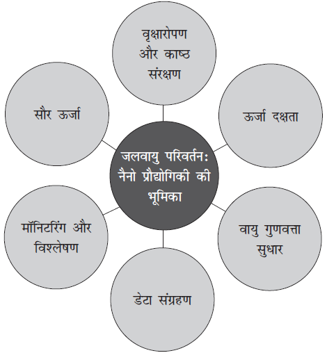 नैनो प्रौद्योगिकी के अंतर्गत पदार्थों की संरचना का नैनोमीटर (1-100 नैनोमीटर) स्तर पर अध्ययन किया जाता है। यहजलवायु परिवर्तन के प्रभावों को कम करने में महत्वपूर्ण भूमिका निभा सकती है।