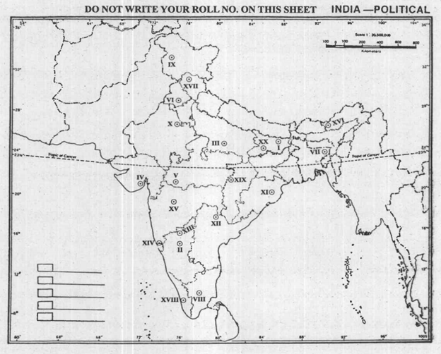 आपको दिए गए मानचित्र पर अंकित निम्नलिखित स्थानों की पहचान कीजिए एवं अपनी प्रश्न-सह--उत्तर पुस्तिका में उनमें से प्रत्येक पर लगभग 30 शब्दों की संक्षिप्त टिप्पणी लिखिए। मानचित्र पर अंकित प्रत्येक स्थान के लिए स्थान-निर्धारण संकेत क्रमानुसार नीचे दिए गए हैं। 50